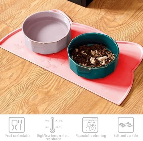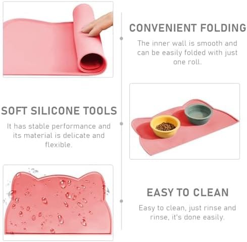 [Contenido del producto] Recibirás 1 alfombrilla de silicona rosa para mascotas con forma de cabeza de gato. Se puede utilizar para alimentar a las mascotas y colocarse debajo del cuenco para mantener el suelo limpio y ordenado.