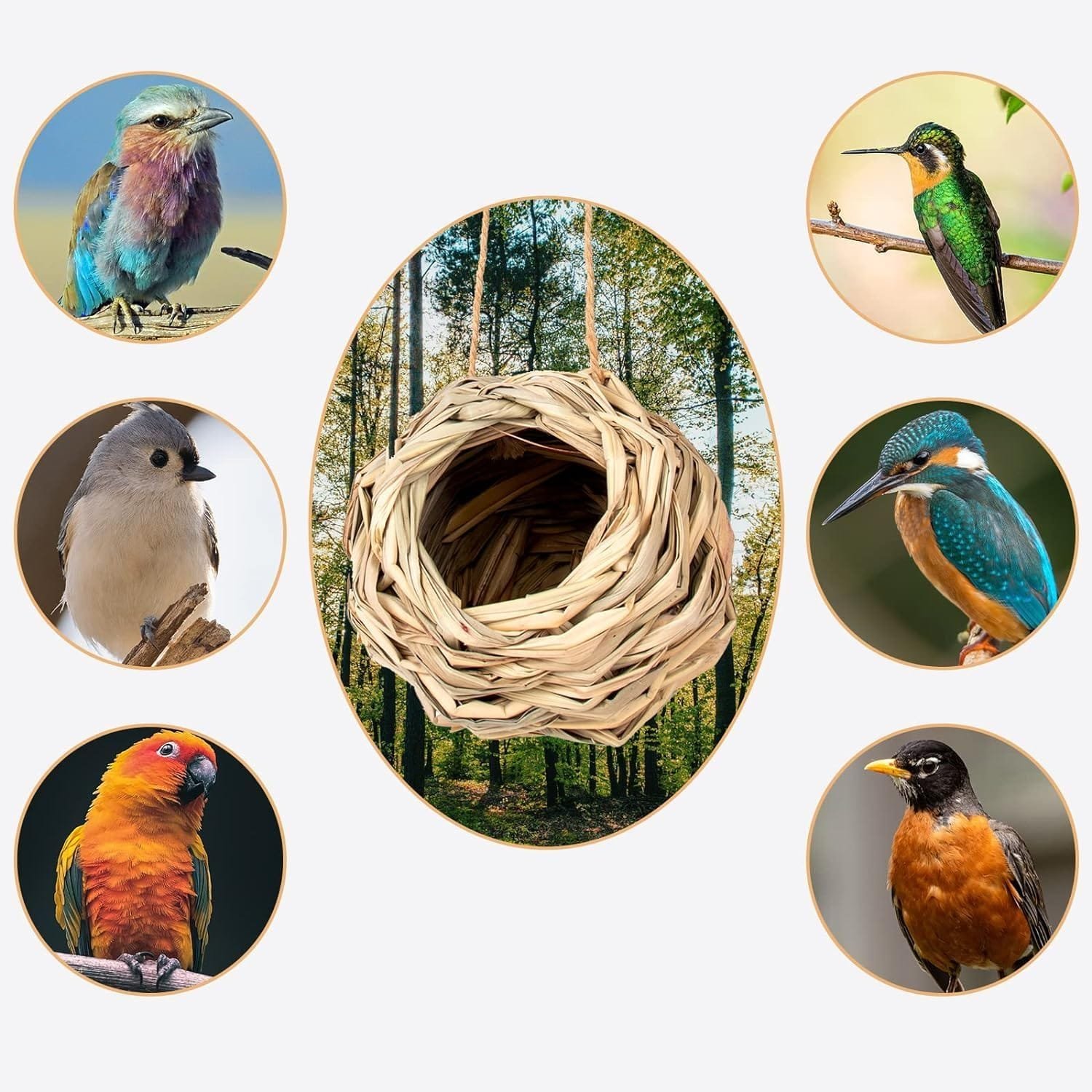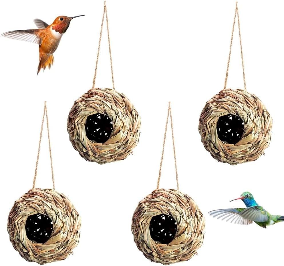 4 Piezas Nidos de Pájaros, Nidos para Pájaros Pequeños de Hierba Natural, Casa de Pajaros Exterior, Tejidas a Mano Hierba Nidos para Pajaros, para Pájaros Pequeños como Colibrí, Teta