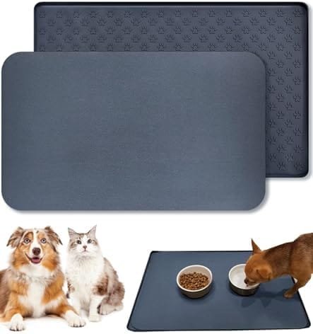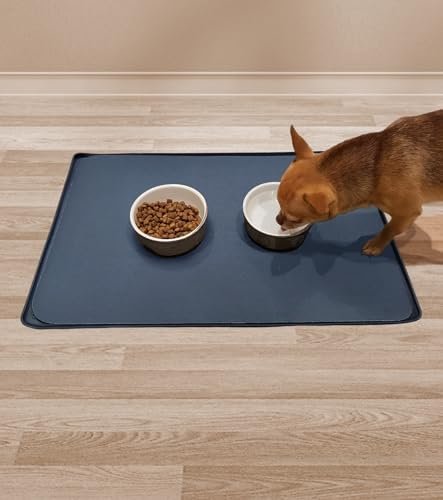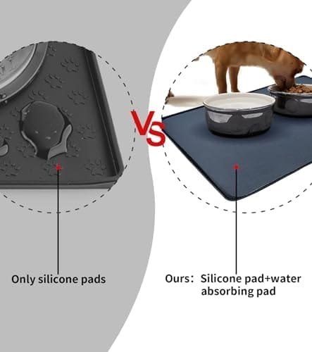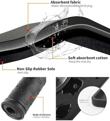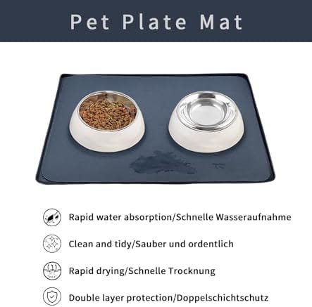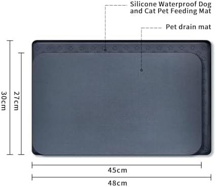 Cojín de Silicona con Bordes+Mantel Absorbente: alfombra alimentación para perros y gatos impermeable y absorbente de agua, no solo se puede utilizar como alfombrilla para comedero, sino que también evita que las manchas de agua de la alfombra contaminen la habitación, de modo que la alfombrilla de comida para perros siempre se mantenga limpia y seca.