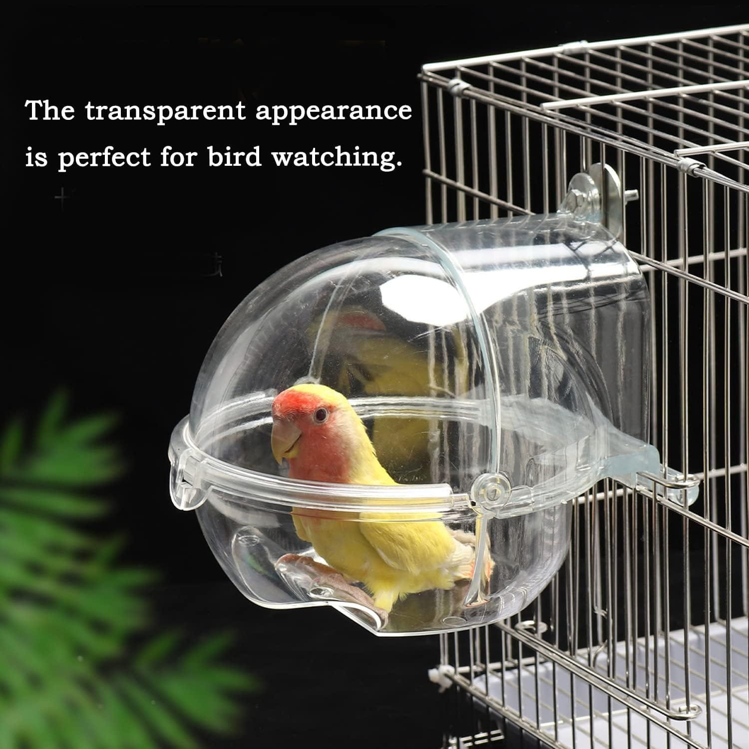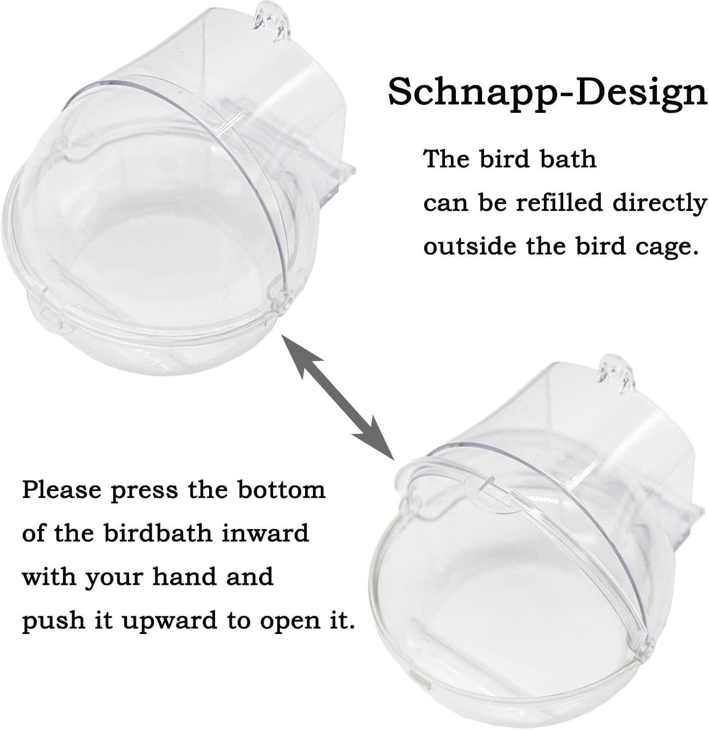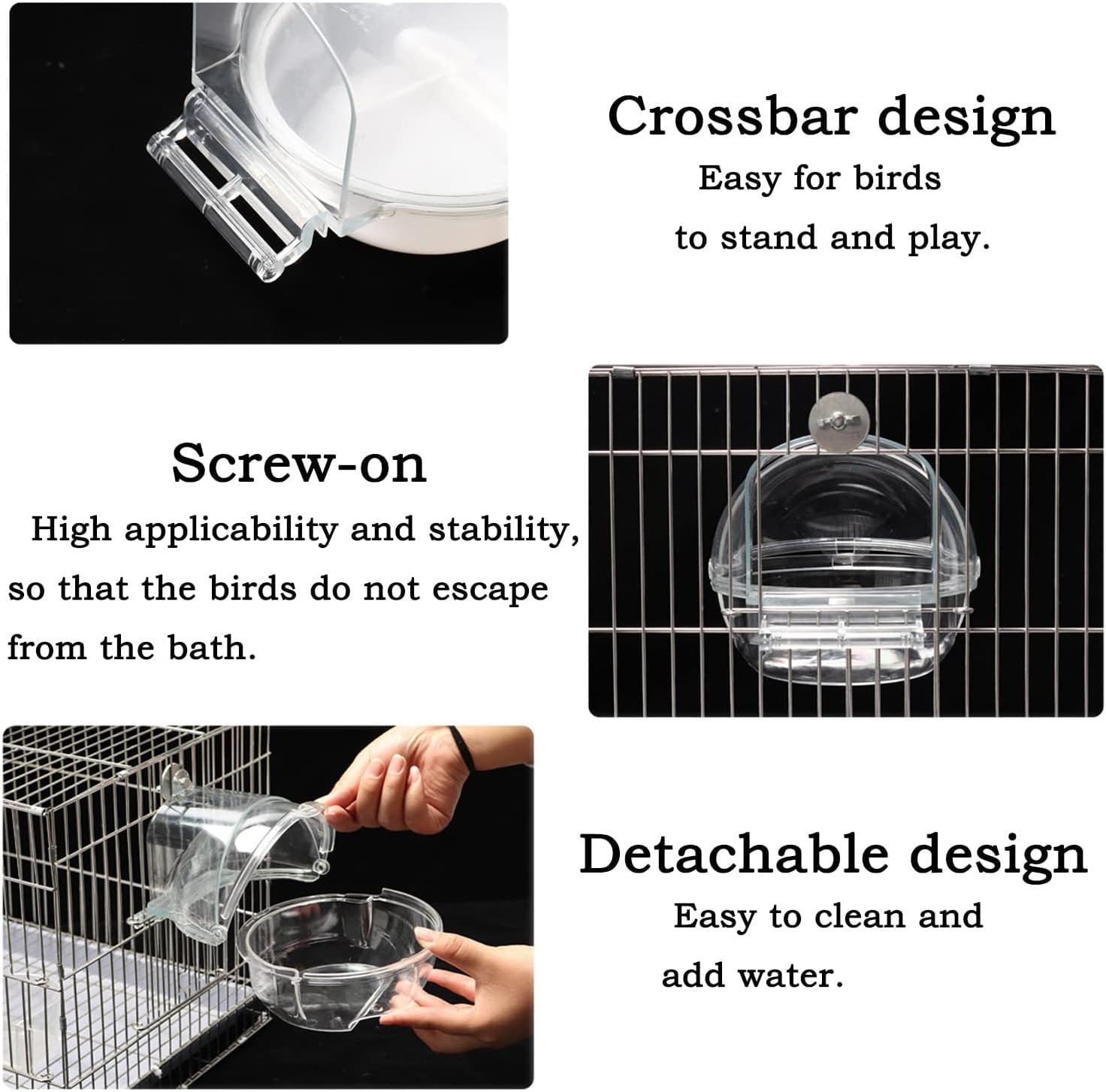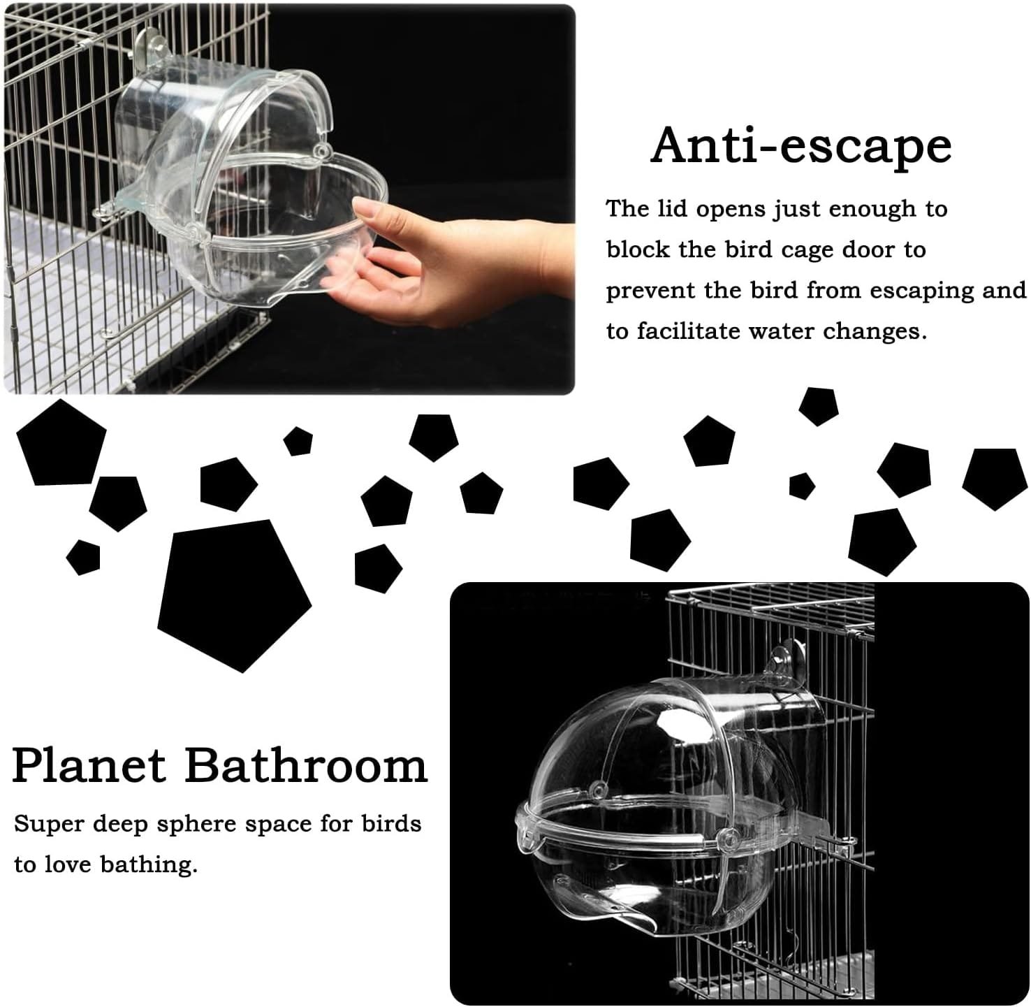 Diseño único: el exclusivo diseño de tapa abatible te permite llenar el baño de pájaros con agua o comida para pájaros directamente desde el exterior de la jaula. Forma esférica, estéticamente agradable y diseño ensanchado para un fácil acceso a las aves.