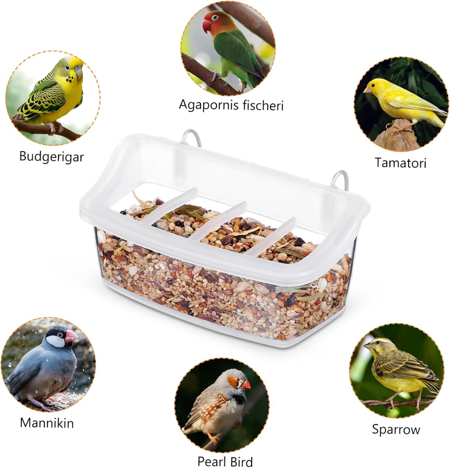 – El comedero para pájaros de plástico está diseñado para pájaros domésticos, como palomas, palomas, pinzones, cacatúas, etc.