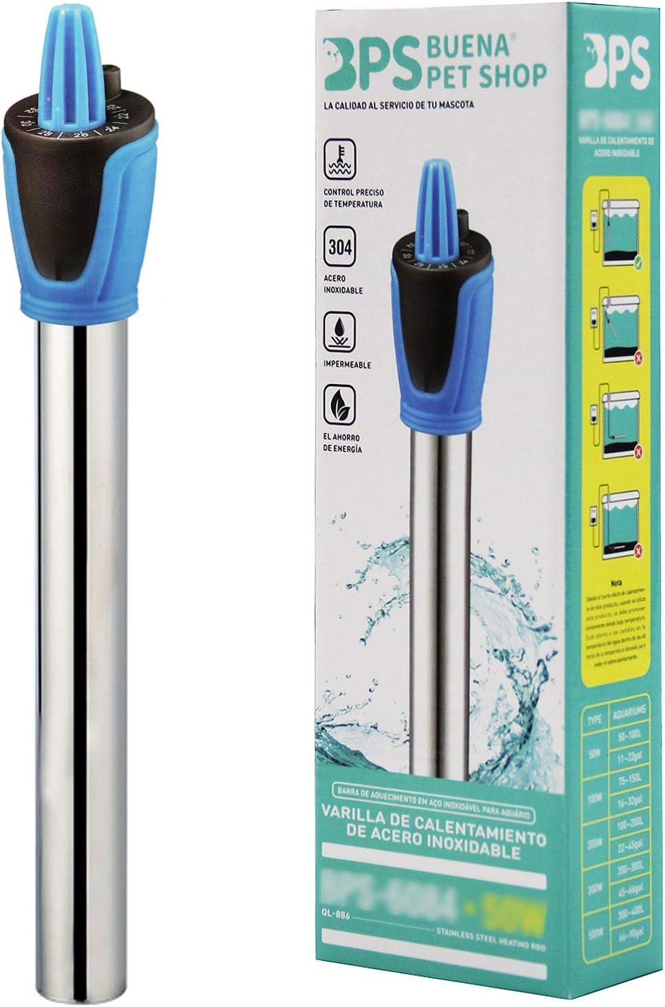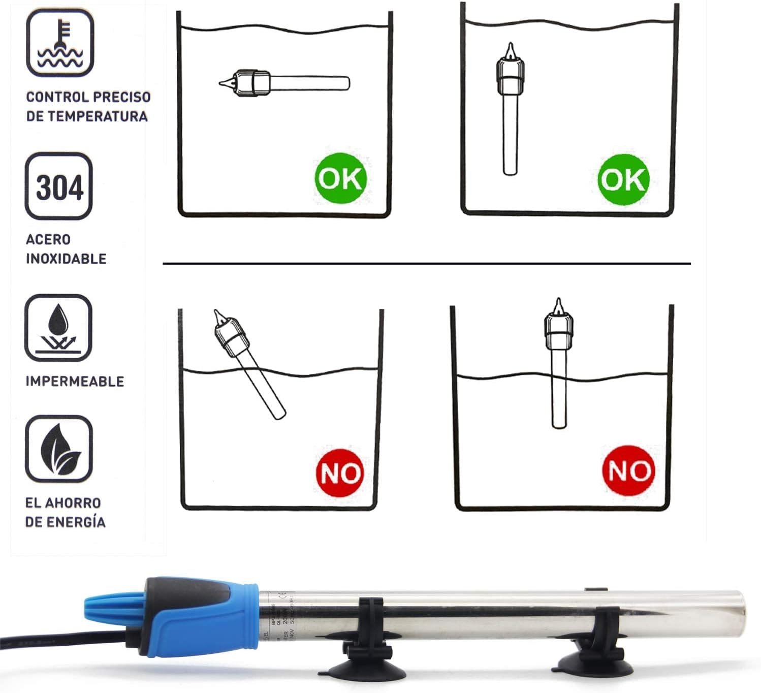 La temperatura de calentamiento fue de 18 a 34 C. Voltaje 220V-240V 50Hz/60Hz. El indicador se ilumina y dice que se calentó. Varillas de calefacción , se recomienda la instalación de un sistema de circulación de agua, la temperatura del tanque alcanzó el mejor efecto de equilibrio. La varilla de calentamiento no debe usarse en la arena, para no afectar el control de temperatura.