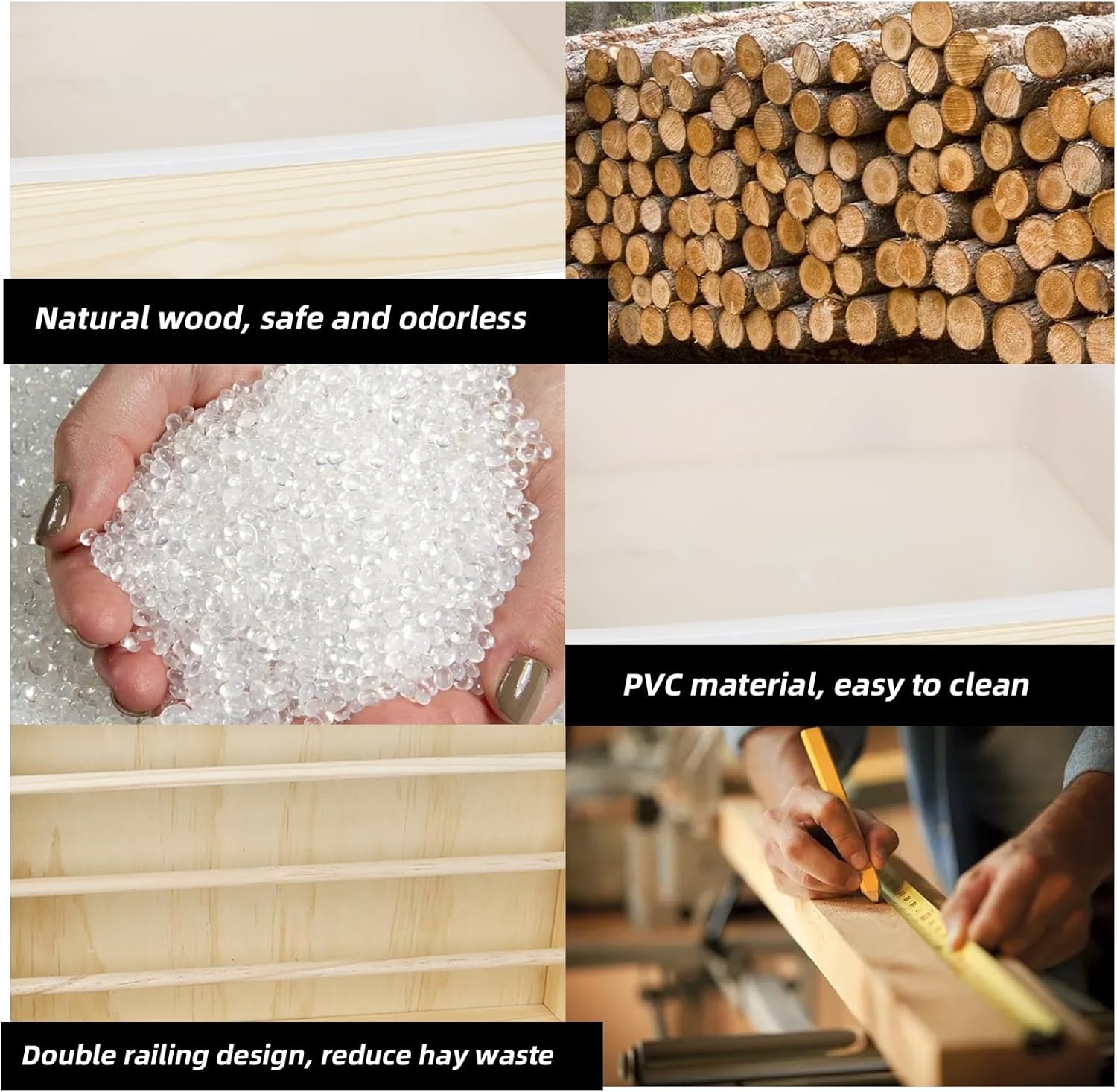 Madera natural: el comedero de heno para conejo está hecho de madera de haya natural de alta calidad, que es segura y respetuosa con el medio ambiente, no tóxica e inodora, resistente y duradera. Hemos engrosado la madera especialmente para que los conejos puedan usar el comedero de heno de forma segura. Para evitar que los conejos se resbalen durante el uso, recomendamos colocar virutas de madera o almohadillas para pañales en el inodoro para lograr una mejor resistencia al deslizamiento.