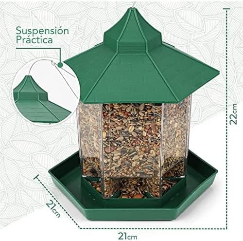 - Gran Capacidad: Puede contener hasta 2,25 kg de semillas y tiene un lazo de sujeción que proporciona estabilidad.