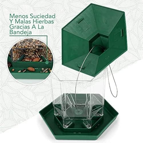 - Fácil de Cuidar: El silo de alimentación transparente protege contra las malas condiciones climáticas y la humedad, reduciendo la suciedad y las malas hierbas gracias a la bandeja de alimentación.