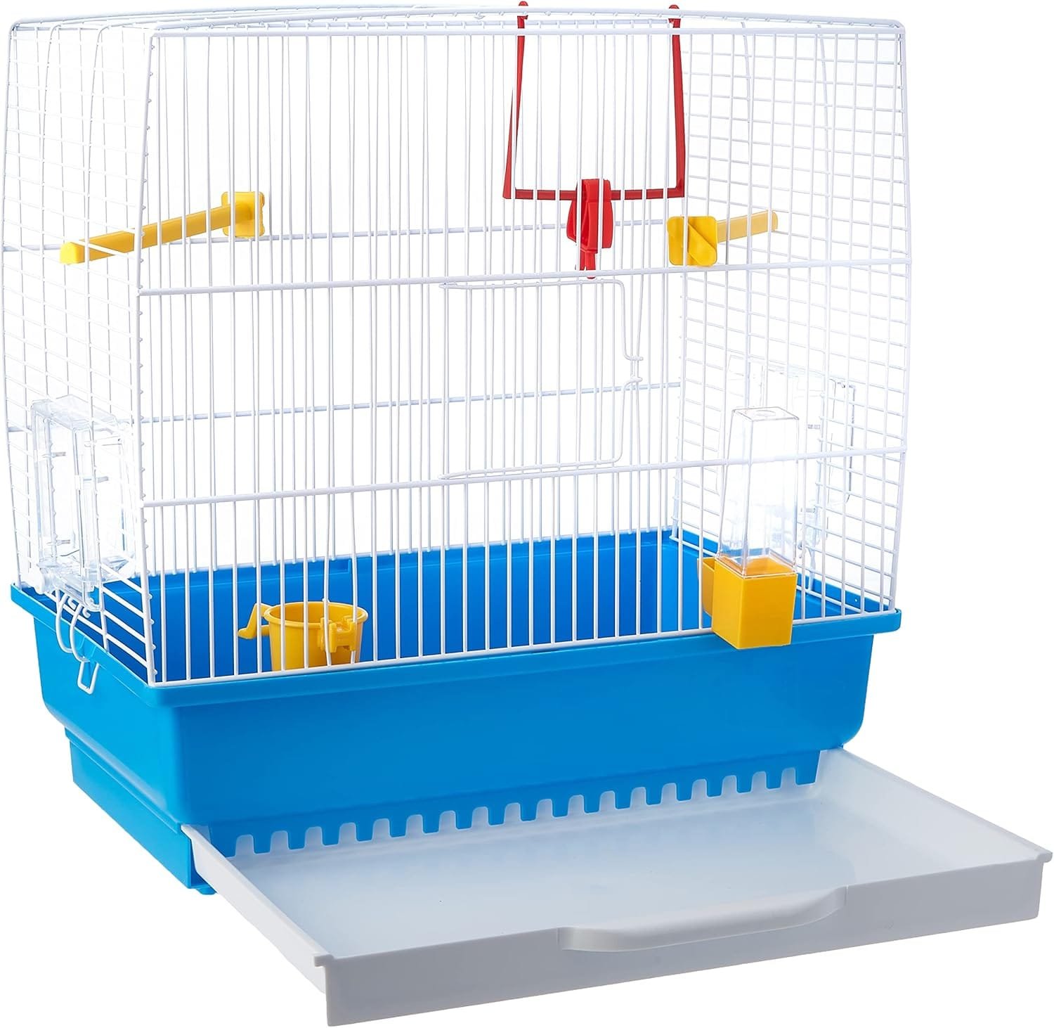 Jaula para pájaros exóticos y canarios formada por una estructura de robusto alambre pintado y una cubeta de plástico rígido