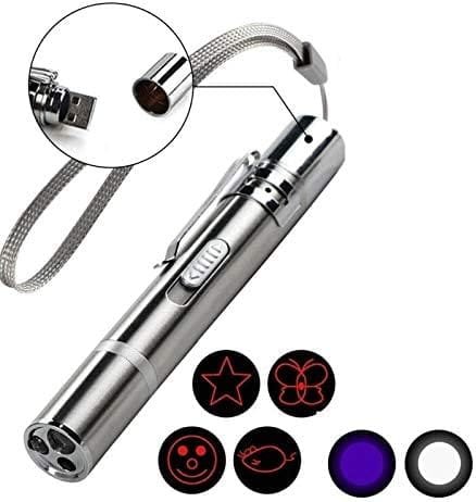 🐱【Actualización 3 en 1 multifunción】versión de actualización 2020 Esta luz tiene 3 modos, incluye luz LED y luz UV. La luz roja con 5 patrones podría usarse como herramienta interactiva de entrenamiento para mascotas. La linterna LED para iluminación de emergencia en el hogar, el detector UV podría usarse como detector de orina de perro, manchas de mascotas y chinches, o autenticar moneda.