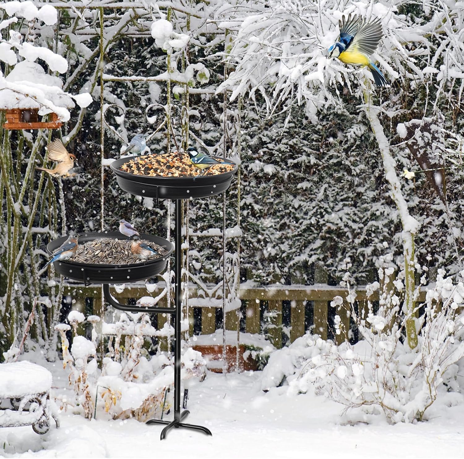 Bandeja para pájaros 2 en 1 Nuestro contenedor de alimento viene con dos bandejas de plástico, una para almacenar comida para colibríes, como granos y maíz, y la otra para guardar pájaros para bañarse o beber. Su apariencia única es perfecta para la decoración de patios al aire libre.