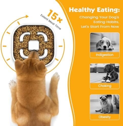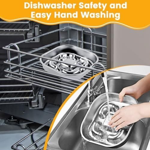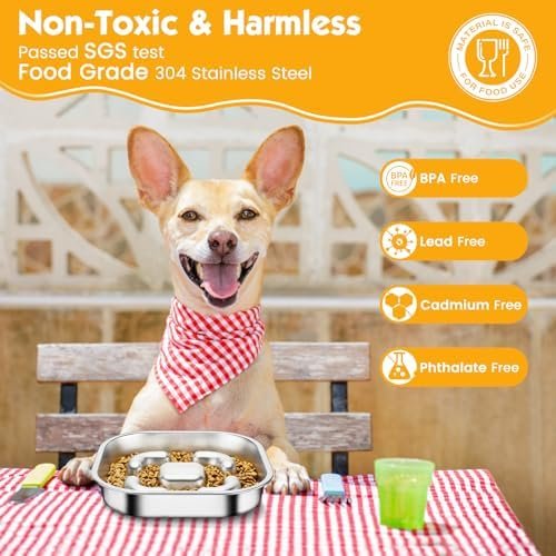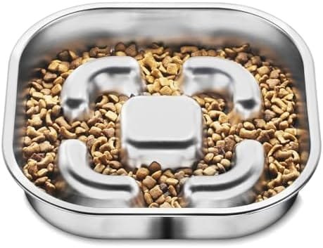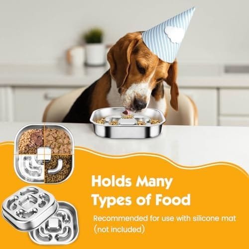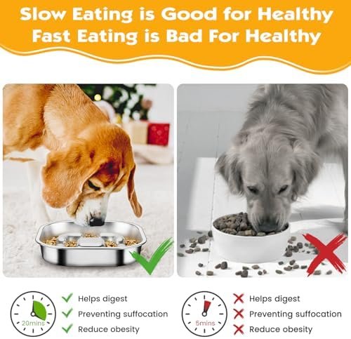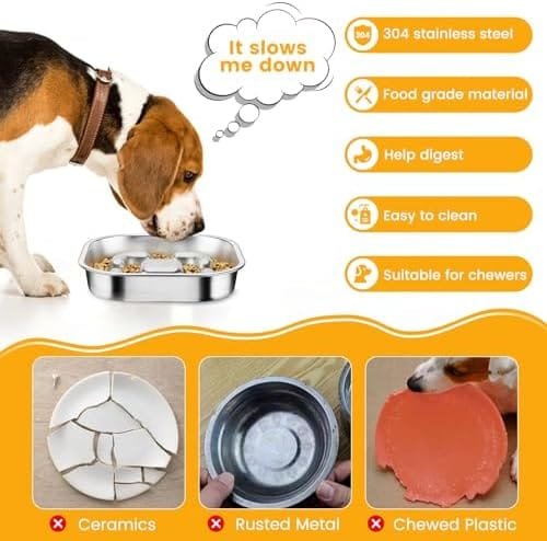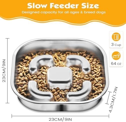 【Gran capacidad】Los cuencos para perros de acero inoxidable tiene un tamaño de 23*23*4.3cm y puede contener 3 tazas de comida. Es ideal para razas medianas y grandes. Es de doble cara, una cara con función de alimentación lenta y la otra cara es para colocar golosinas para mascotas. Es perfecto para proporcionar alimento seco, húmedo y crudo, brindando a los perros una mejor experiencia de masticación y sabor.