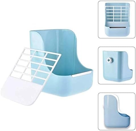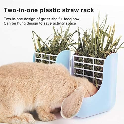 MATERIAL: El comedero / rejilla de heno para conejos está hecho de plástico y metal de alta calidad, no tóxico y duradero. En el borde de la rejilla de heno está reforzado con una lámina de metal para evitar que la mascota mastique.