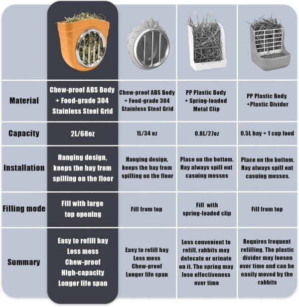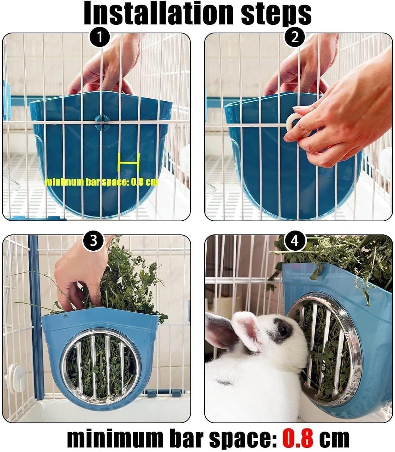 No se requieren herramientas para una fácil instalación, y con una capacidad de 2 litros, todo lo que necesita hacer es llenar el comedero con heno y dejar que sus amigos peludos disfruten de su comida.