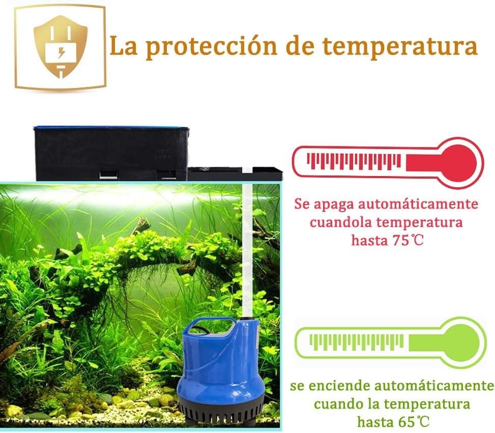 La bomba de agua sumergible 360° entrada de agua – puede inhalar estiércol de pescado y impureza en el agua,puede instalar manguera de agua en boquilla de bomba para sacar agua,mantiene limpio para el ambiente de acuario pecera y estanque,filtro bomba muy práctico.