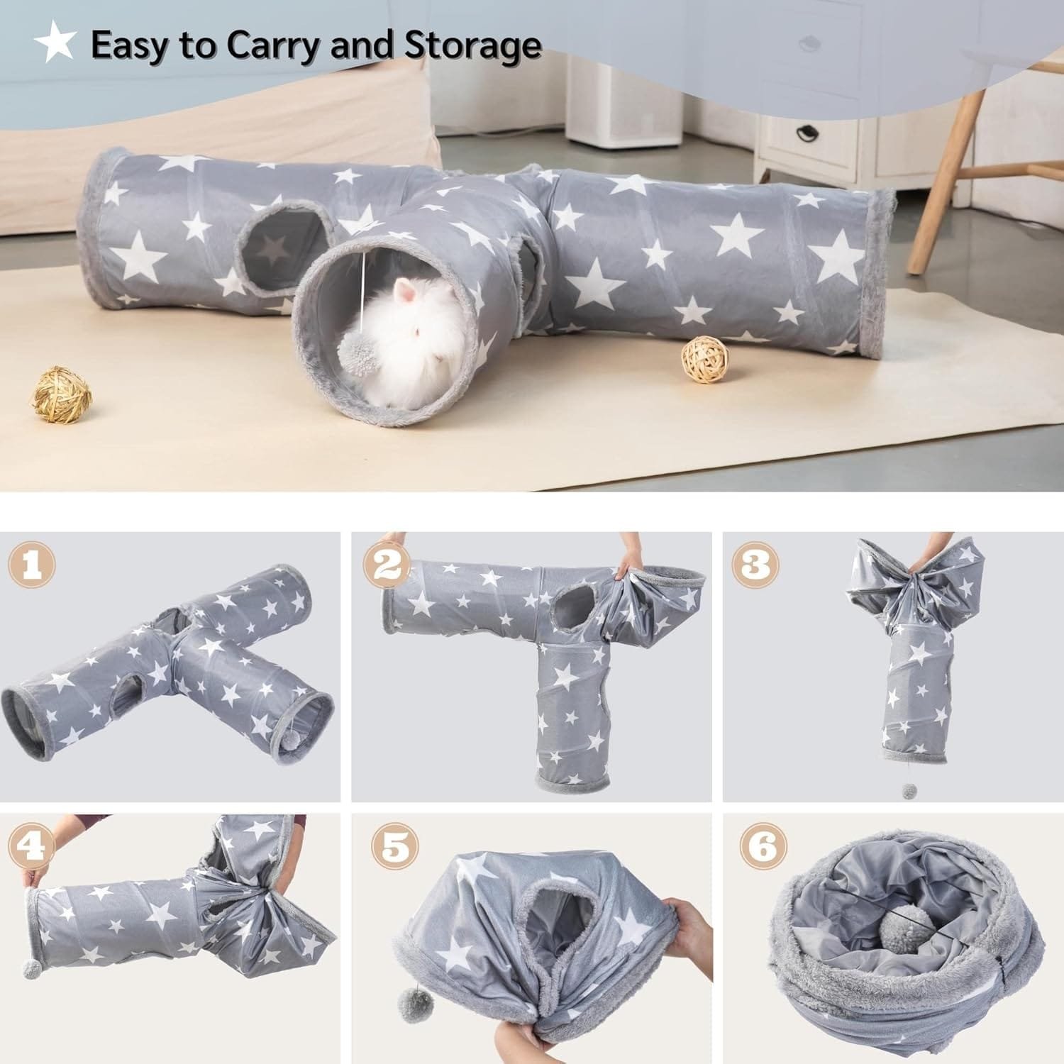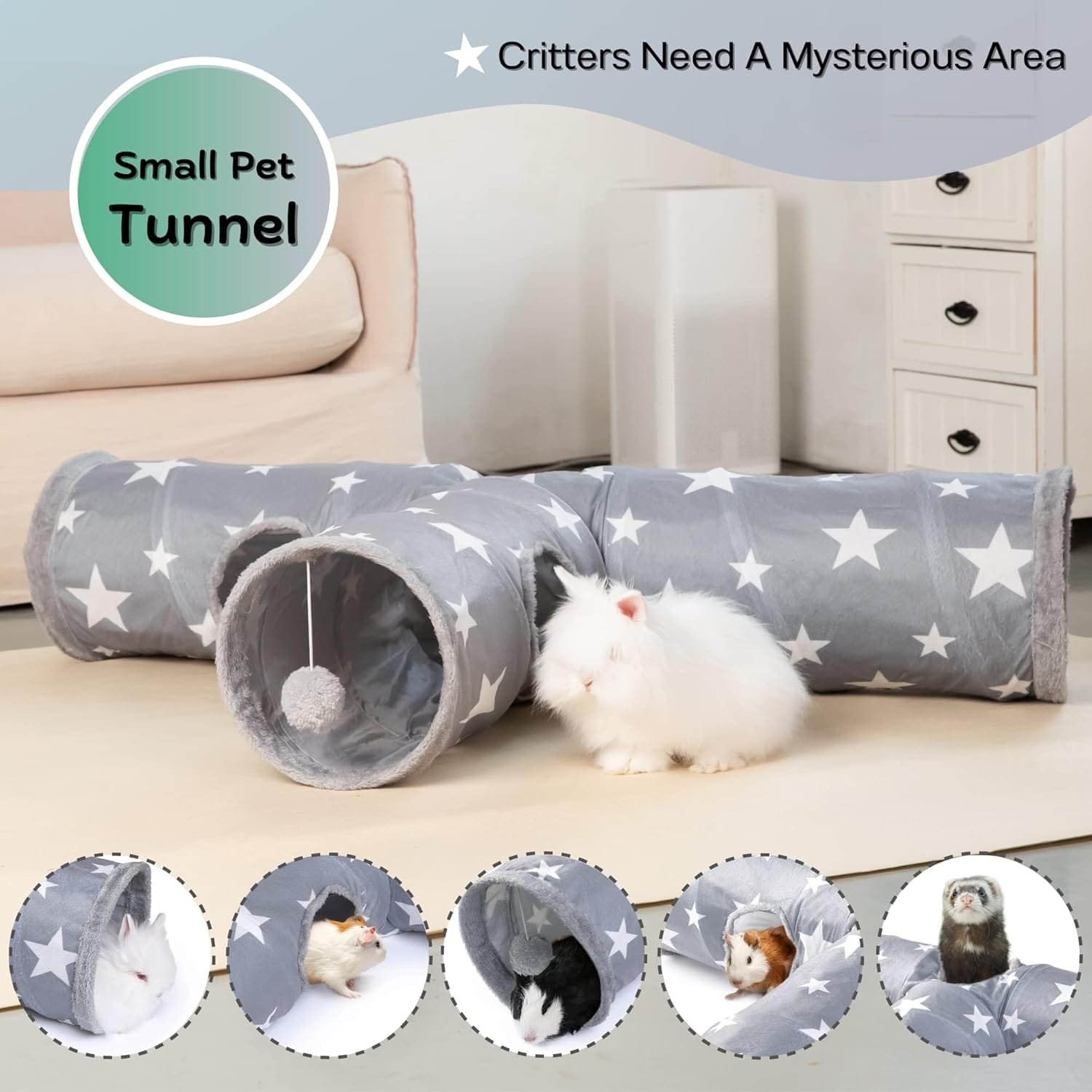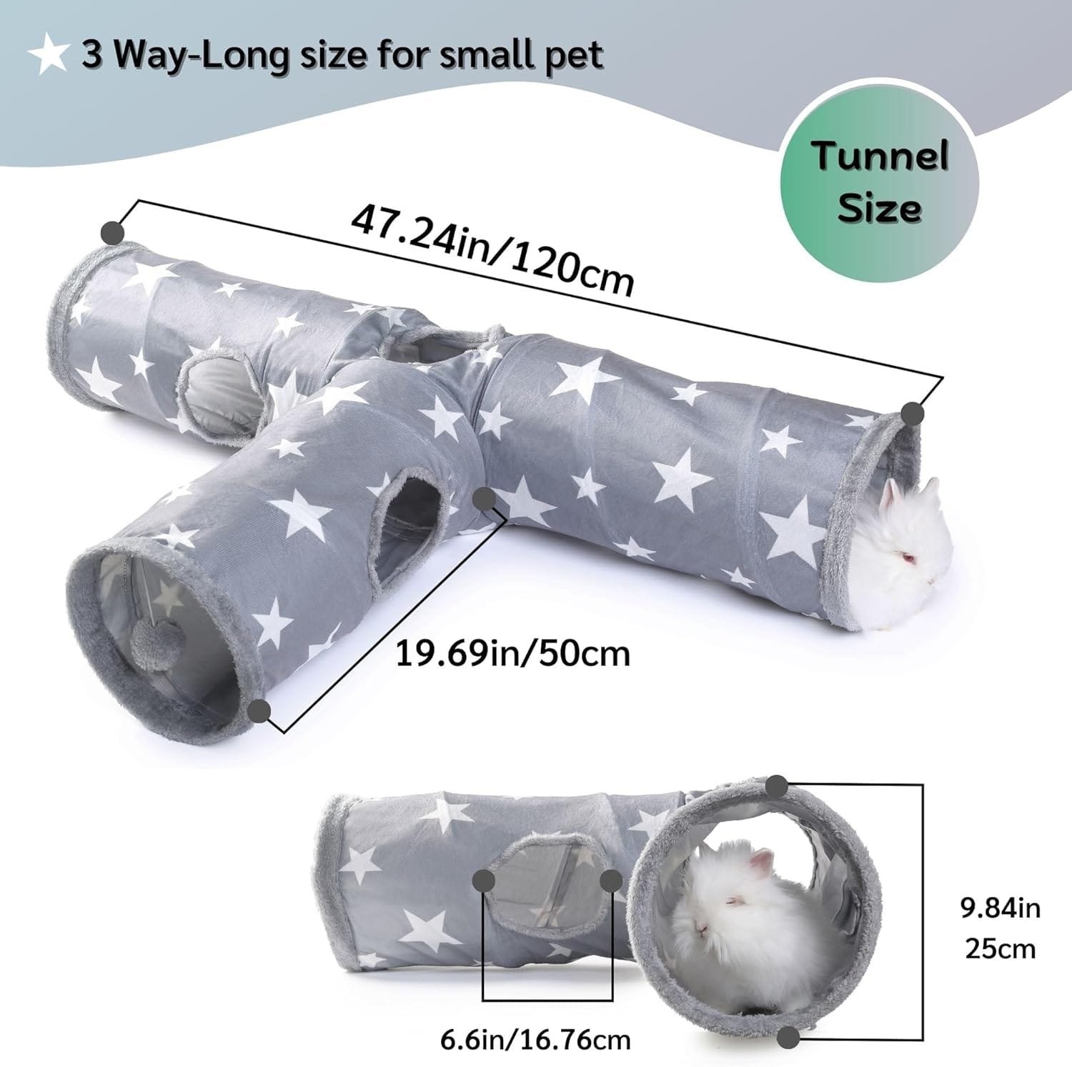 Tamaño: túnel largo en forma de T (50 pulgadas), túnel corto (20.4 pulgadas), tres aberturas grandes (10.5 x 10.5 pulgadas), tres aberturas pequeñas (5.5 x 6.0 pulgadas), bola colgante de entrada (2.5 x 2.5 pulgadas), ideal para animales pequeños como conejillos de indias, conejos, conejos enanos. chinchilla, ferRet, gatito y otras mascotas pequeñas