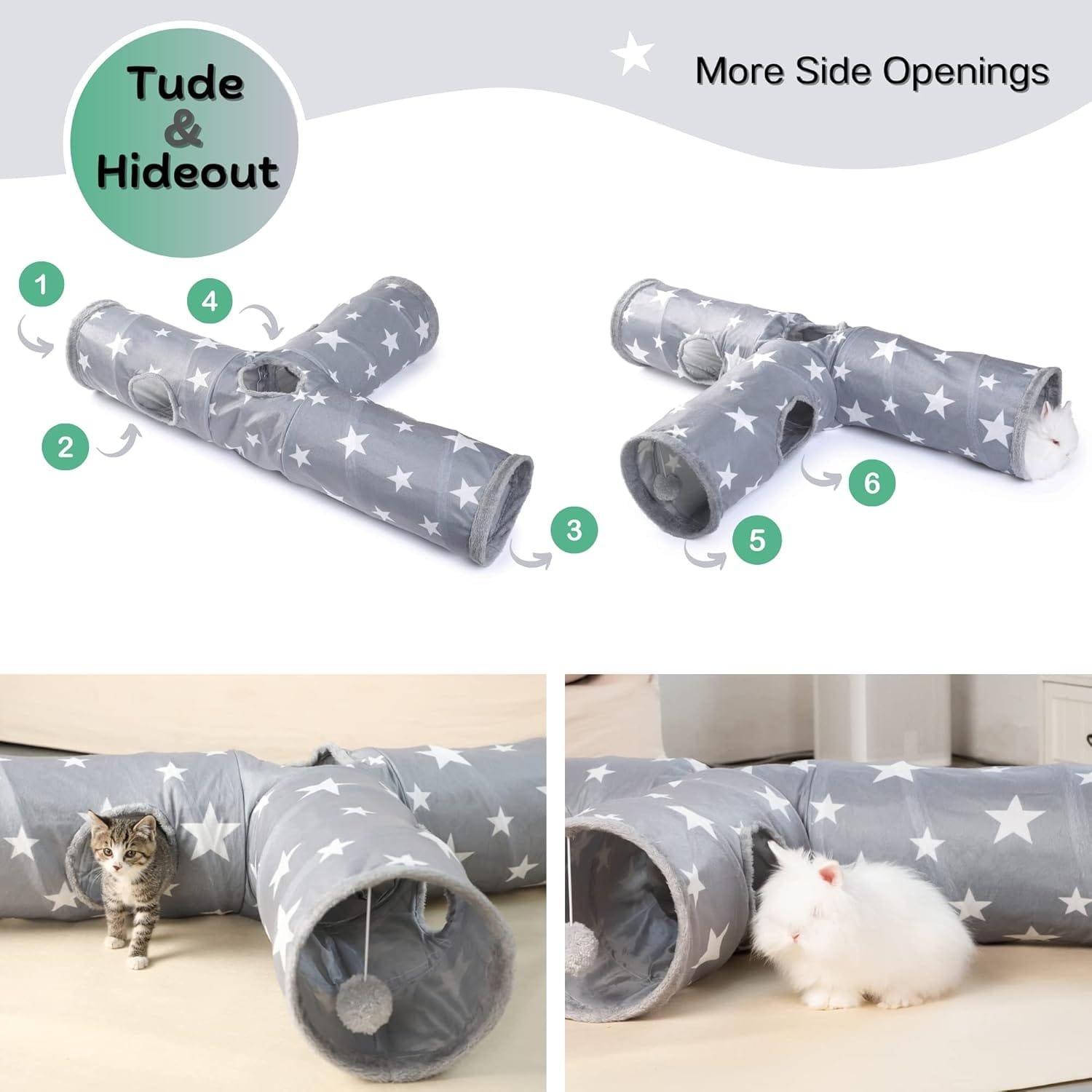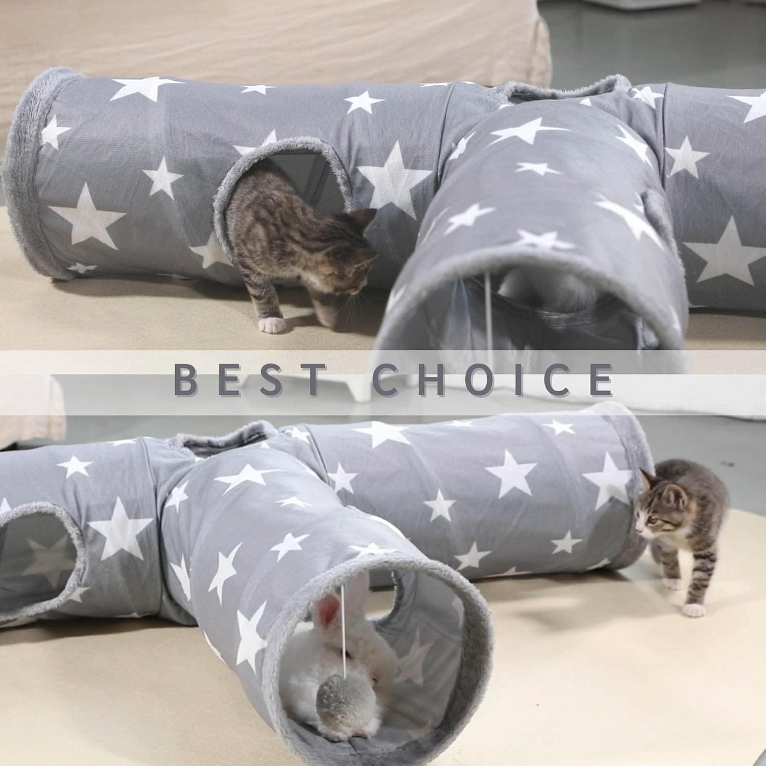 Tamaño: túnel largo de juguetes en forma de T (50 pulgadas), túnel corto (20.4 pulgadas), tres aberturas grandes (10.5 x 10.5 pulgadas), tres aberturas pequeñas (5.5 x 6.0 pulgadas), bola colgante de entrada (2.5 x 2.5 pulgadas), ideal para animales pequeños como cobayas, conejos, conejos enanos. chinchilla,hurón, gatito y otras mascotas pequeñas (si el peso es inferior a 2 libras, se recomienda comprar otros túneles pequeños en nuestra tienda)