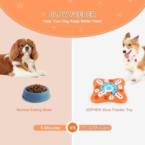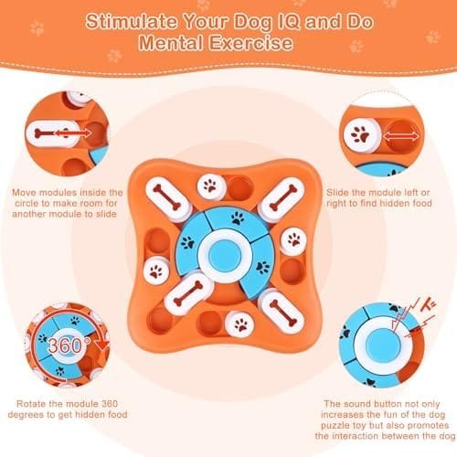 Diseño Perfecto, Mejor Regalo Para Perros: Botón chirriante en el centro, más fácil de atraer la atención de perros y gatos. 11 puntos de movimiento y 16 agujeros de comida para perros diseñados para maximizar el tiempo de alimentación y fomentar los instintos naturales de caza de su mascota, permitiendo que los perros inteligentes usen sus habilidades de nariz y pata para averiguar a través de los pasos, mejorar el coeficiente intelectual del perro y entrenar el sentido del olfato de su mascota