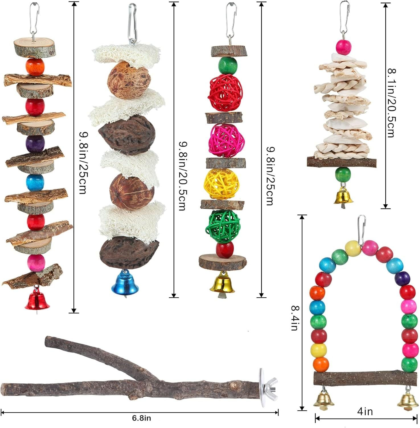 Juguetes de perca para pájaros, juguetes de periquito, paquete de 6 accesorios de jaula de pájaros, juguetes masticables de madera, soporte de perca para loro, conure, cacatúa, tortolito, periquito y otros pájaros de tamaño pequeño a mediano