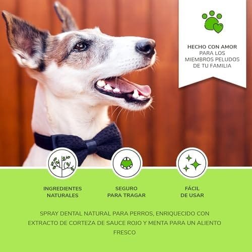 Ingredientes naturales: Spray dental natural para perros, enriquecido con extracto de corteza de sauce rojo y menta para un aliento fresco.