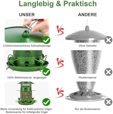 Nuestro comedero para colibríes está hecho de metal de alta calidad, lo que significa que puede durar más que otros de plástico. Después de atraer a los pájaros en busca de comida, los pájaros habitan en los soportes y disfrutar de la comida de semillas a través de los agujeros, entonces usted podría ver las aves desde las ventanas, cubiertas o terrazas.