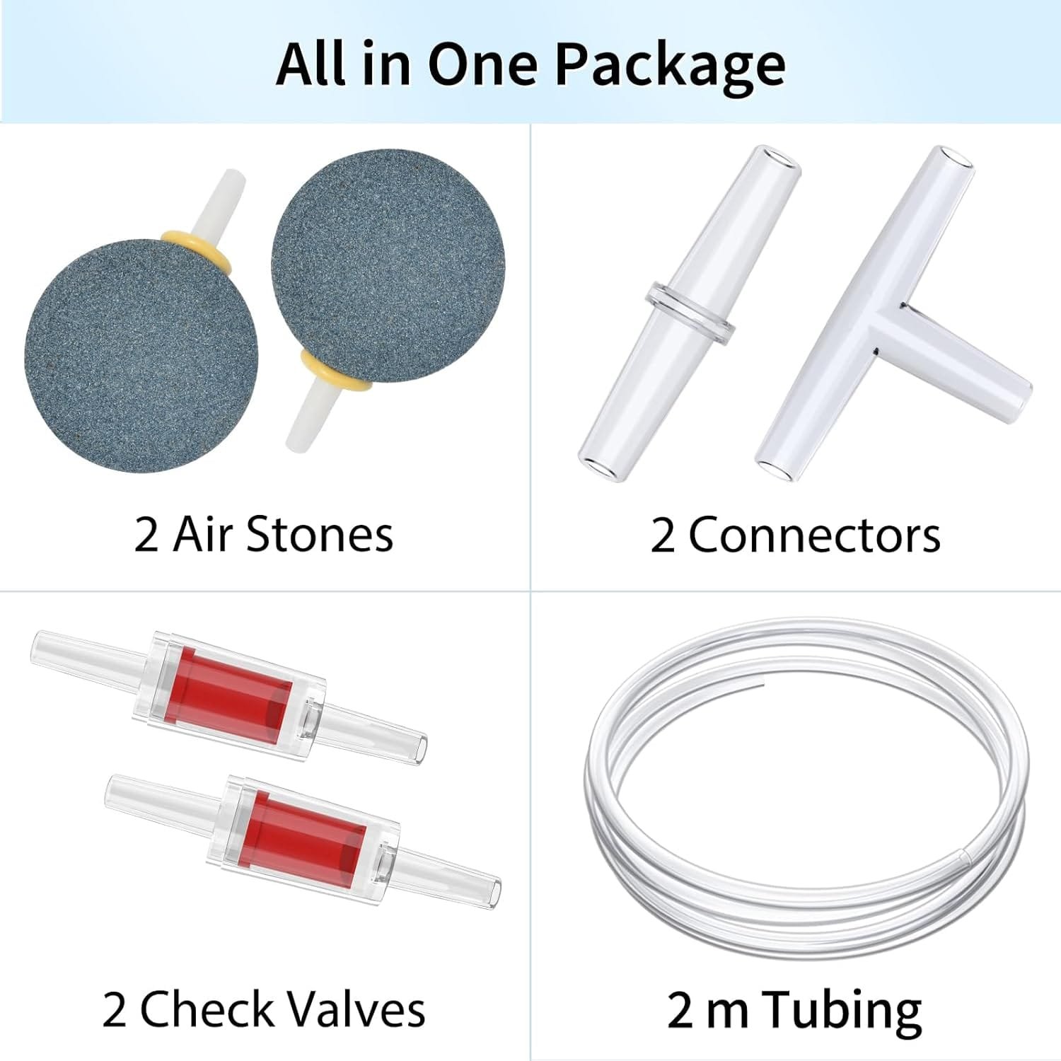 Accesorios de la bomba: Incluye 2 piedras de aire, 2 m de tubo de aire, 2 válvulas de retención y 2 conectores. Accesorios completos para construir la instalación básica de aireación en su acuario.