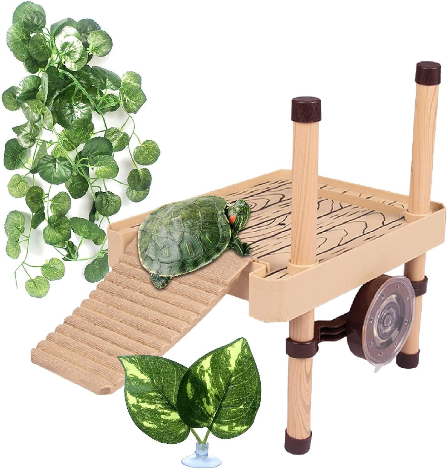 Incluye una rampa con textura que se engancha en cualquier punto a lo largo del borde frontal del muelle para que pueda personalizar donde va. Esta rampa proporciona acceso completo y fácil a la Plataforma para su tortuga pequeña, mediana, salamandra, rana o tritón.
