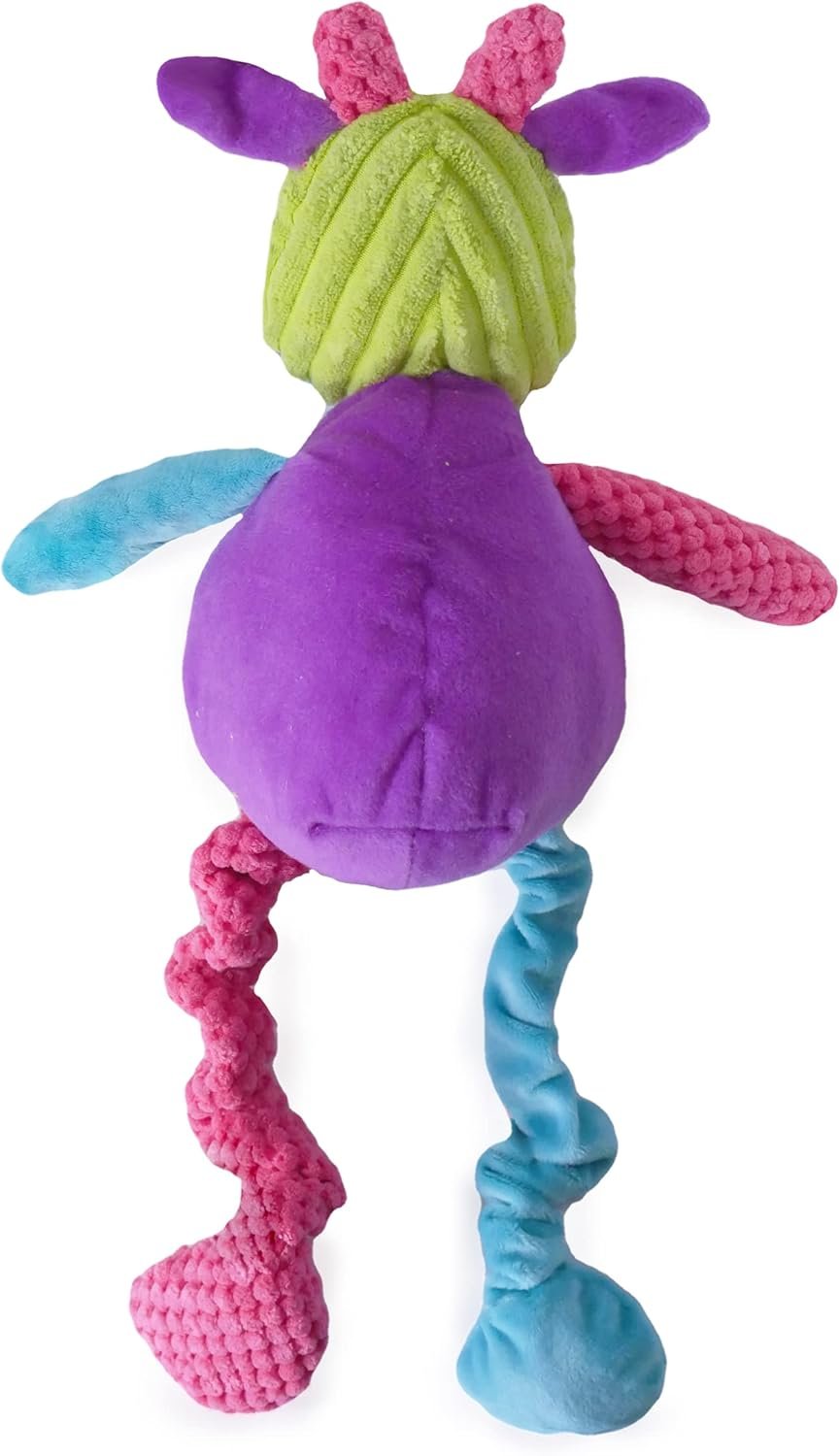 The toy has a lot of different things to stimulate dogs. The stomach crinkles, it squeaks, and the legs are stretchy. The toy is great, but it will not last long with dogs that are rough with toys (like my dog).