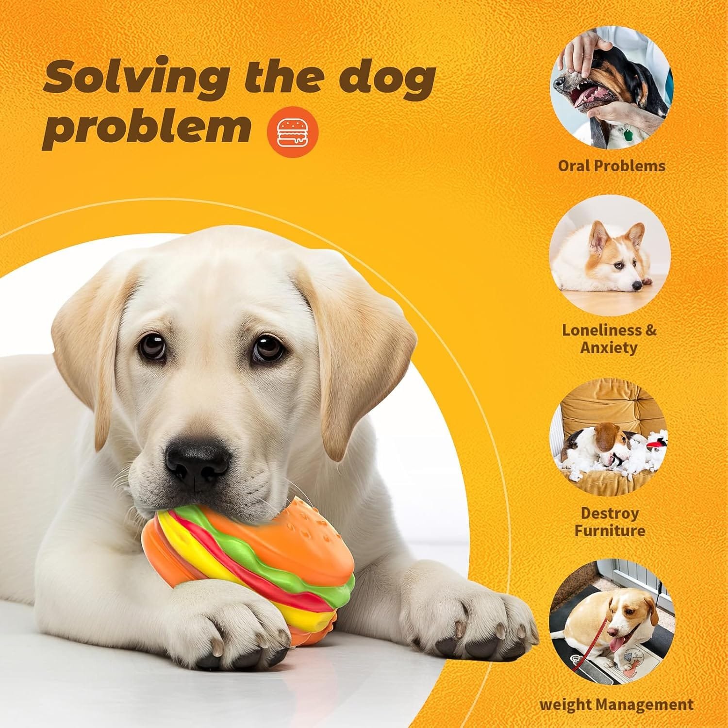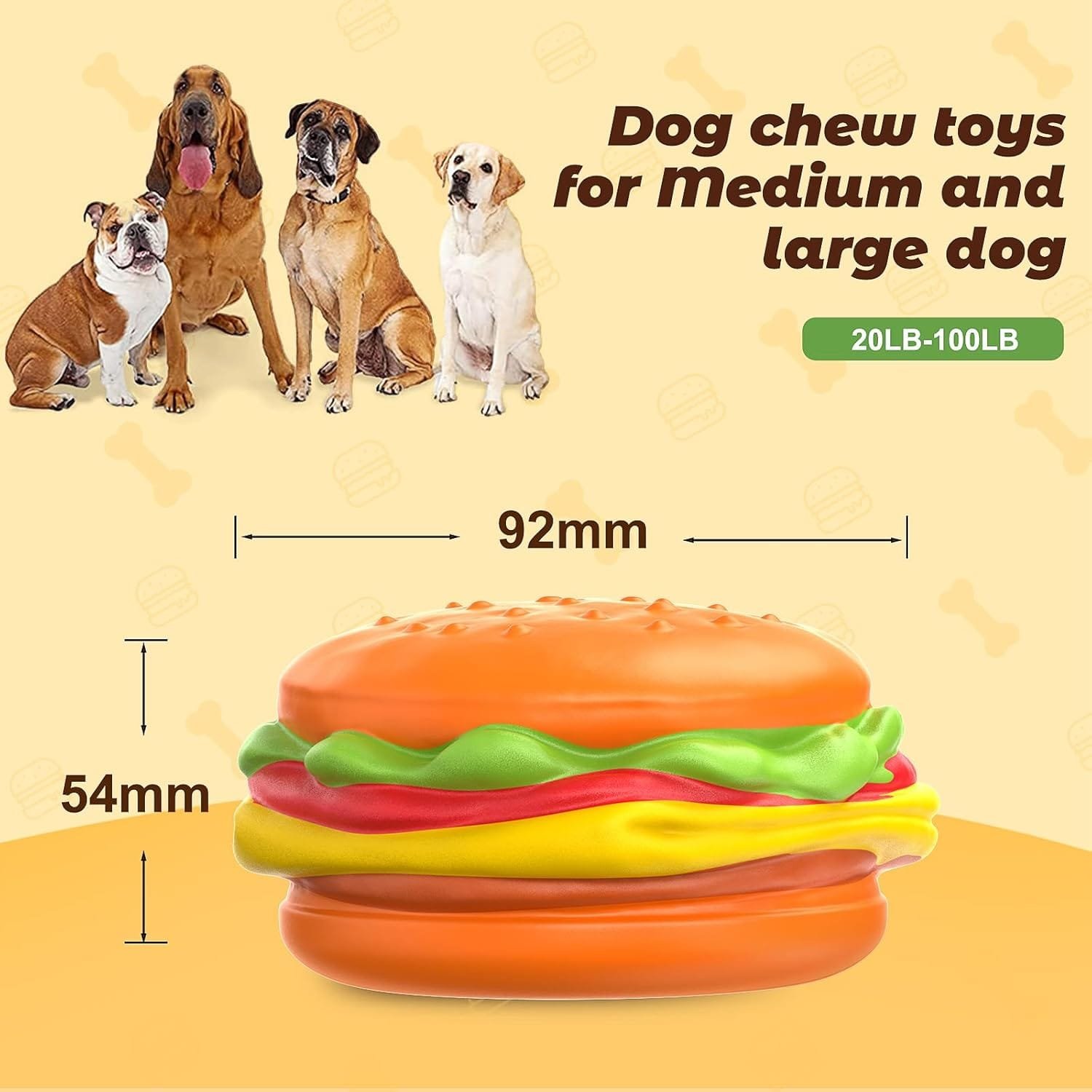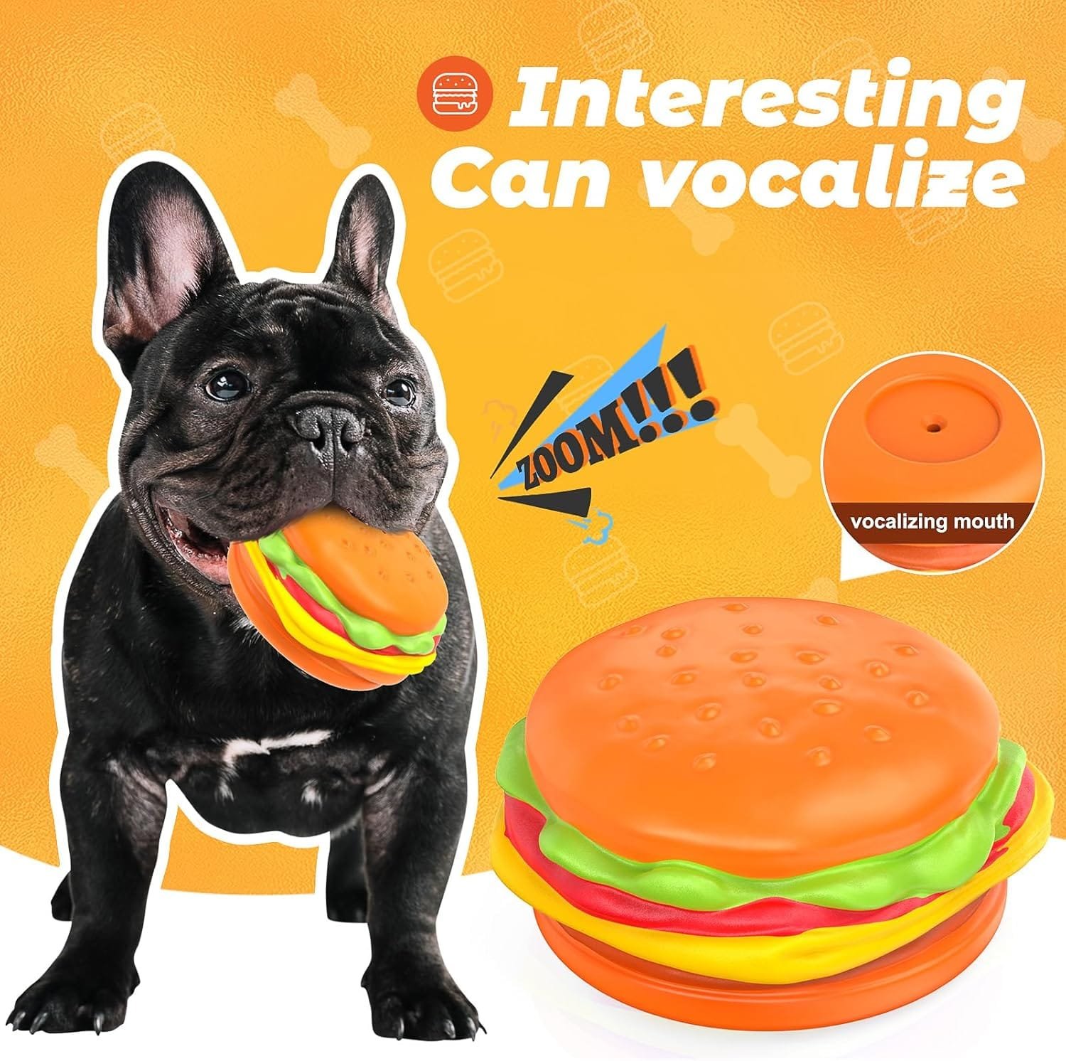 [Sabor innovador y diseño de sonido] El sabor a leche y el diseño en forma de hamburguesa atraen su atención, la hacen emocionada y feliz al masticar. El chirrido hace que los perros sean más curiosos e interesados en los juguetes para masticar sin morder más los muebles de las zapatillas.