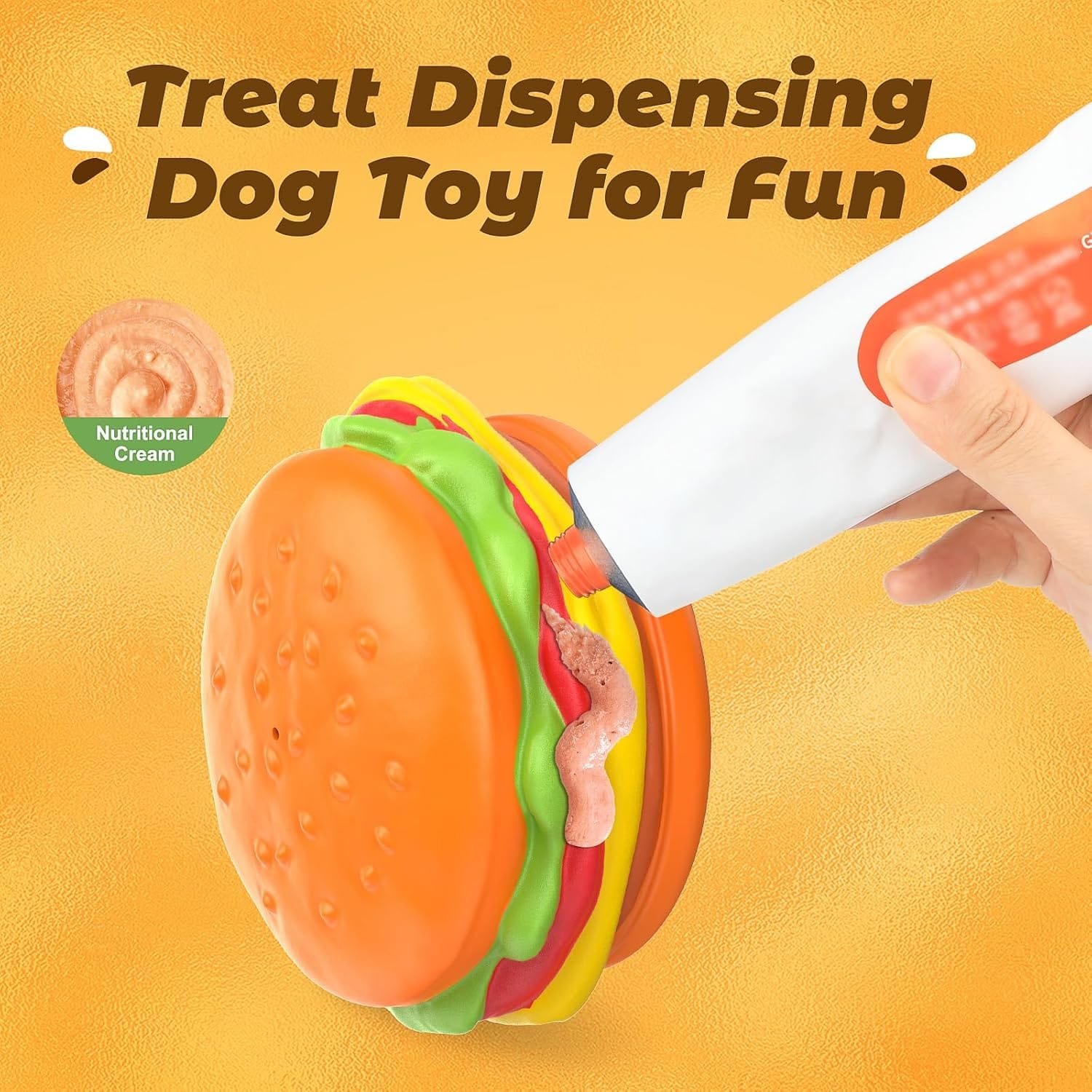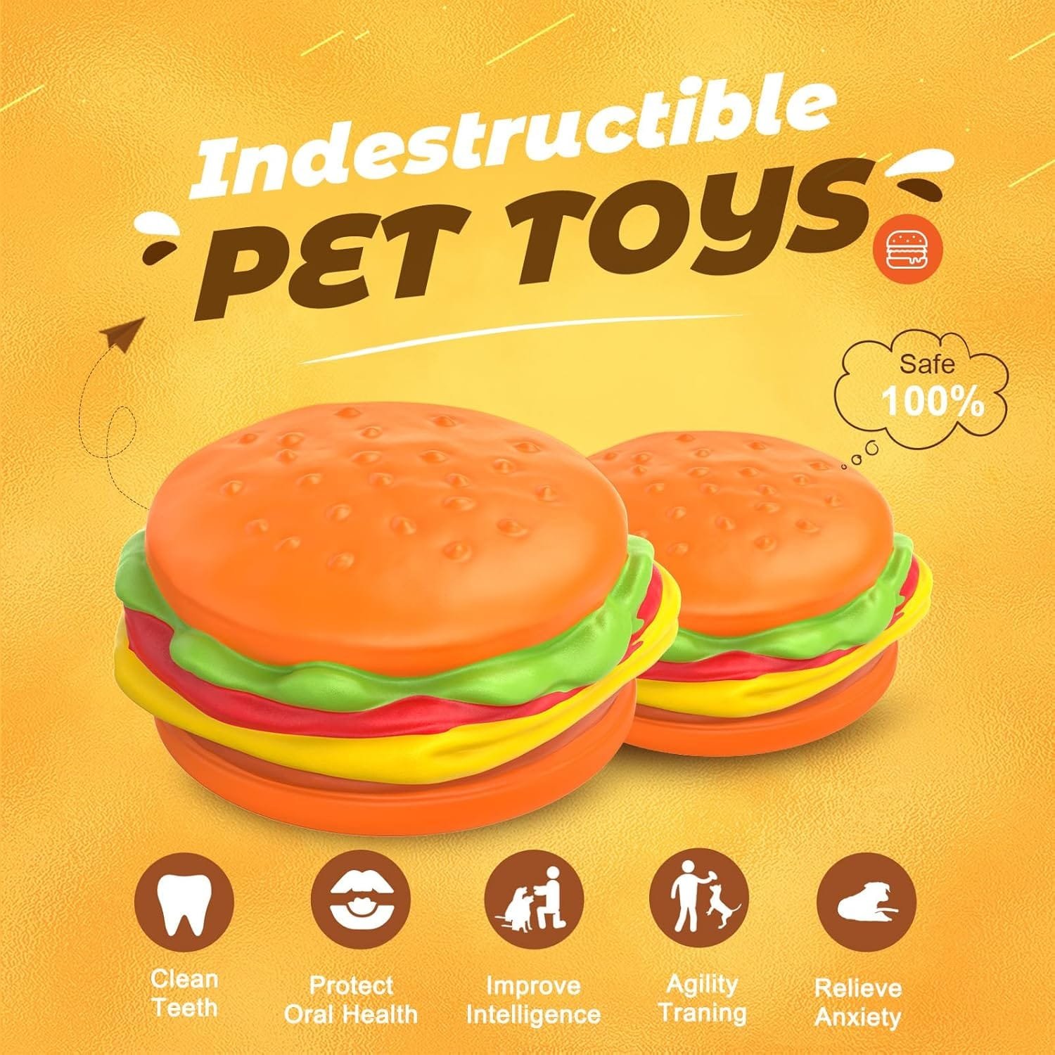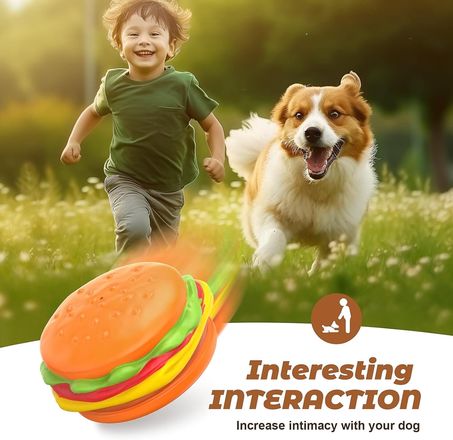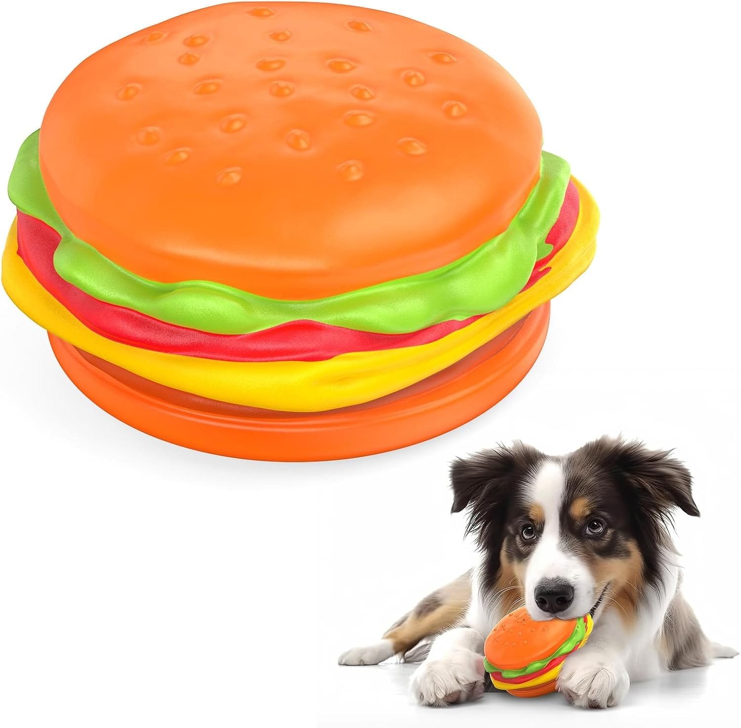 [Sabor innovador y diseño de sonido] El sabor a leche y el diseño en forma de hamburguesa atraen su atención, la hacen emocionada y feliz al masticar. El chirrido hace que los perros sean más curiosos e interesados en los juguetes para masticar sin morder más los muebles de las zapatillas.