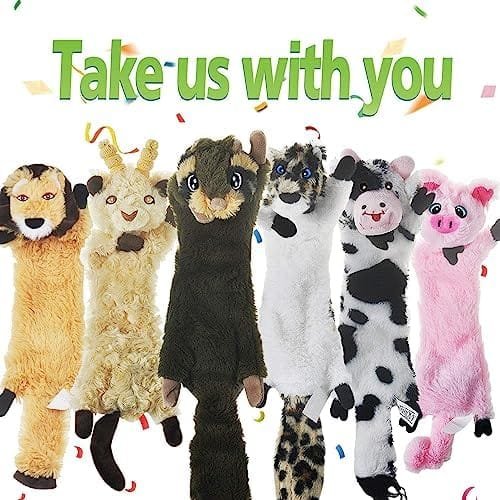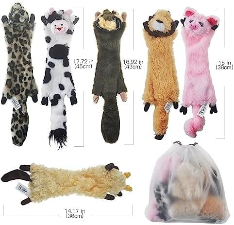 Paquete de juguetes de gran valor: ^-^ paquete de 6 juguetes peludos para perros, incluyendo cerdo, cordero, león, vaca, ardilla de leopardo, todo en forma de animal, plano y sin relleno. Cada juego viene con una bolsa de almacenamiento. A tu cachorro les encantará a sus nuevos amigos chirriantes.