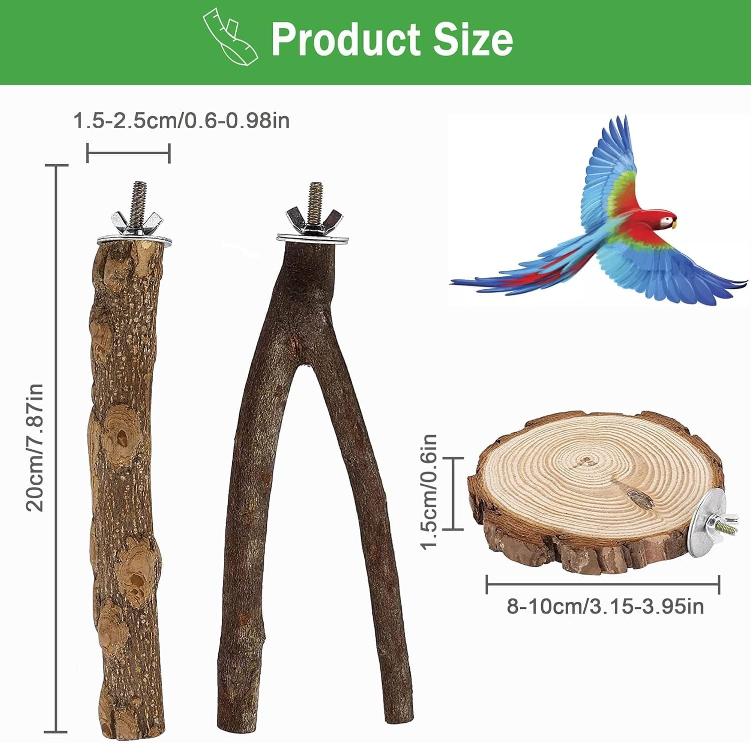 Tamaño del producto: el kit Bird Habitat incluye 1 bastón, 1 rama y 2 tablas de pie. El diámetro de la barra de pie es de 1,5 – 2,5 cm y la longitud es de 20 cm; el diámetro de la rama es de 1,5 – 2,5 cm y la longitud es de 20 cm; el grosor de la placa de pie es de aproximadamente 1,5 cm y el diámetro es de aproximadamente 8 – 10 cm.