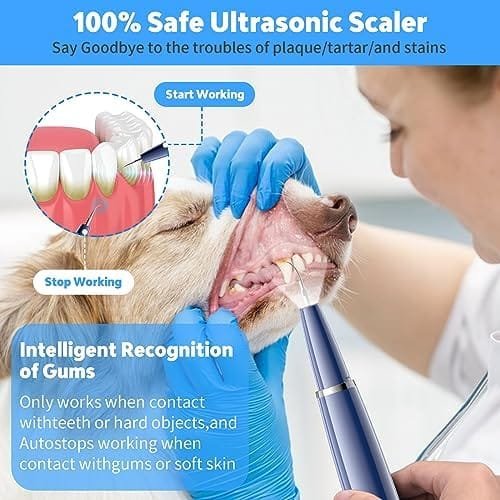 🦷【Cepillo dientes perro ultrasónico 100% seguro】Este limpiador de dientes adopta la última tecnología ultrasónica inteligente para eliminar eficazmente el sarro de los dientes de mascotas como perros y gatos. Solo funciona cuando toca dientes u objetos duros, y deja de funcionar automáticamente cuando toca encías o piel suave. Es científico y seguro, no daña los dientes y protege la salud dental.