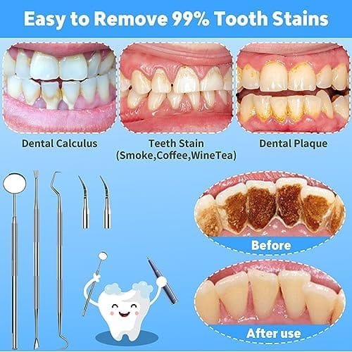 Vibración de alta frecuencia: hasta 300,0000 vibraciones por minuto, elimina rápidamente el sarro, la placa, el sarro y las manchas.5 modos de trabajo ajustables: Soft, Comfort, Standard, Strong y Extra Strong. Puedes elegir según tus necesidades.Absolutamente seguro: Sunlary Ultrasonic Tartar Remover, que utiliza tecnología inteligente de ondas de sonido de alta frecuencia, se detendrá al tocar las encías mientras trabaja, evitando daños en las encías. Y reduce el daño a la dentina y las encías causado por las herramientas dentales manuales.Cuidado dental completo en casa: Este kit de limpieza dental es una solución efectiva y conveniente para el cuidado dental en el hogar. Elimine eficazmente el sarro, la placa, el sarro y raspe las manchas en la superficie del diente.