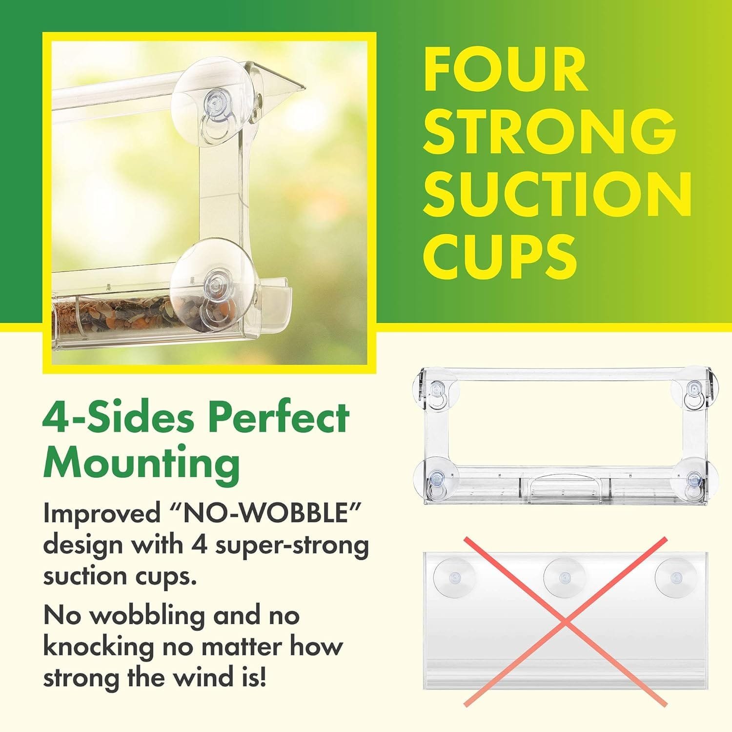 Das bringt die Natur ins Wohnzimmer.Das Futterhäuschen ist ideal zur Fütterung am Fenster.Die Saugnäpfe halten super fest. Es hat schon einen Sturm überstanden ohne Probleme.Da es eine groÃe Ãffnung hat,ist das beobachten der Vögel am Fenster sehr leicht gemacht.Durch die heraus nehmbare Futterschale ist die Fütterung sehr leicht gemacht.ich kann dieses Futterhaus nur empfehlen.