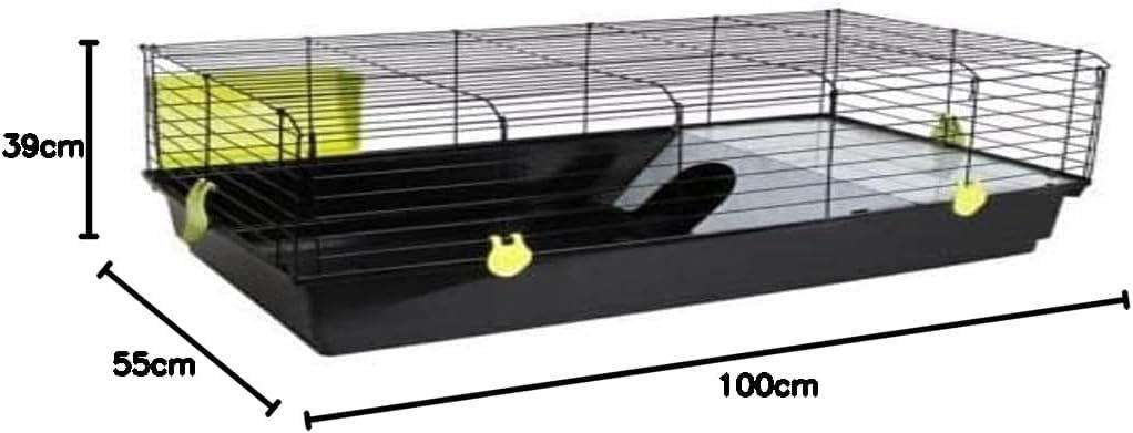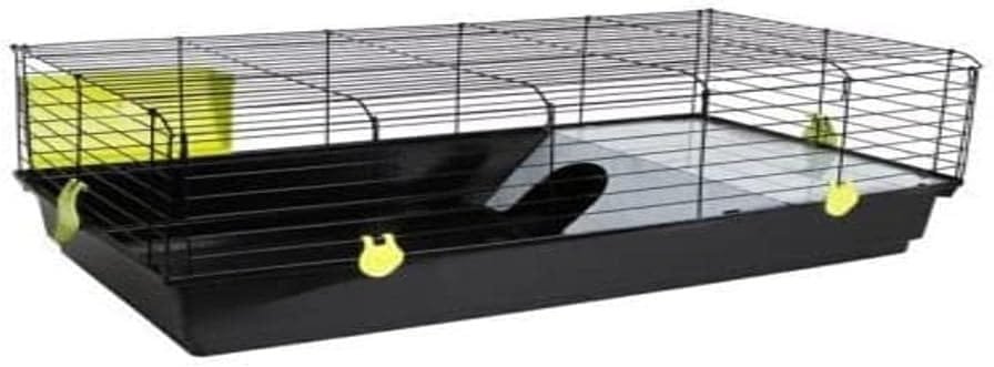 Se trata de una jaula lo suficientemente espaciosa para un conejo enano. Dispone de apertura lateral que se puede mantener fija para que el animal acceda libremente a la jaula que me resulta muy útil. Trae un bebedero y un comedero para el animal que estan bien. El bebedero se tiene que ajustar con el alambre que trae en la parte superior ya que no permite fijarlo a las rejas de la jaula. El refugio de la jaula es correcto pero quizás demasiado justo para un conejo… No lo suele utilizar mucho.