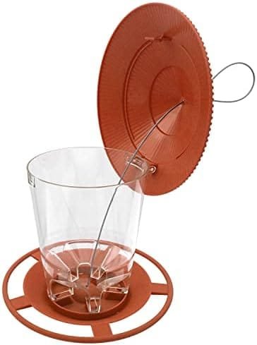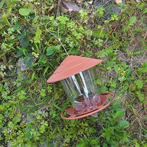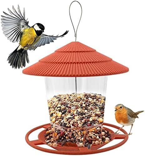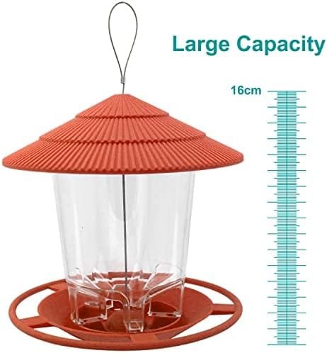 Cubierta superior a prueba de lluvia: La tapa superior del comedero estilo mirador para aves silvestres al aire libre tiene ranuras en forma de alero y un gran tamaño de 16 cm de diámetro, que puede bloquear el agua de lluvia para que no ingrese al contenedor de alimentación para pájaros. Asegúrese de que la cubierta esté bloqueada en su lugar para evitar ardillas